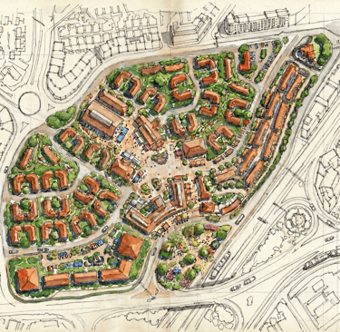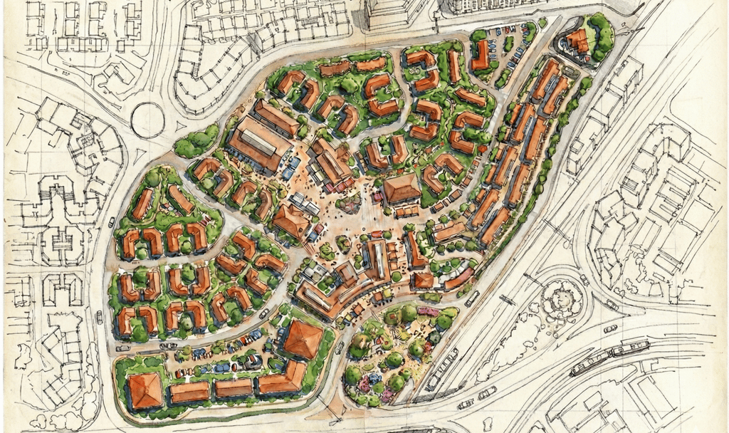 The masterplan is structured as a clear, legible system of centers and connections. Residential blocks form calm, shaded clusters with courtyards and garden edges, feeding into a continuous pedestrian network. At the core, a central park and civic plaza acts as the district’s primary gathering ground, anchored by community programs such as the library and weekly market. Streets are intentionally human-scaled and tree-lined, balancing access with comfort and creating a safe public realm where walking becomes the default experience.