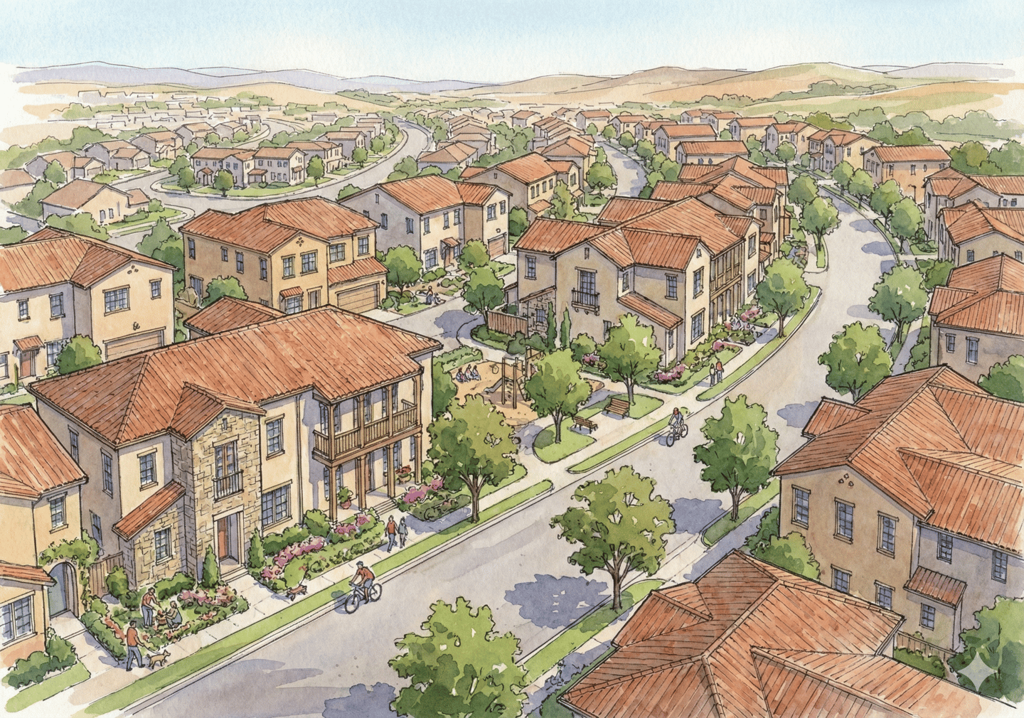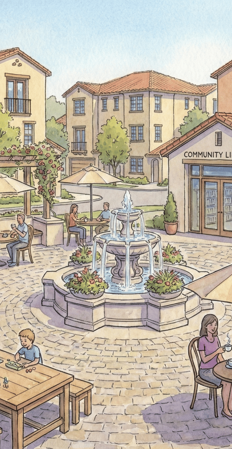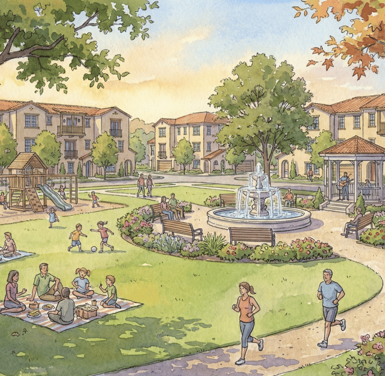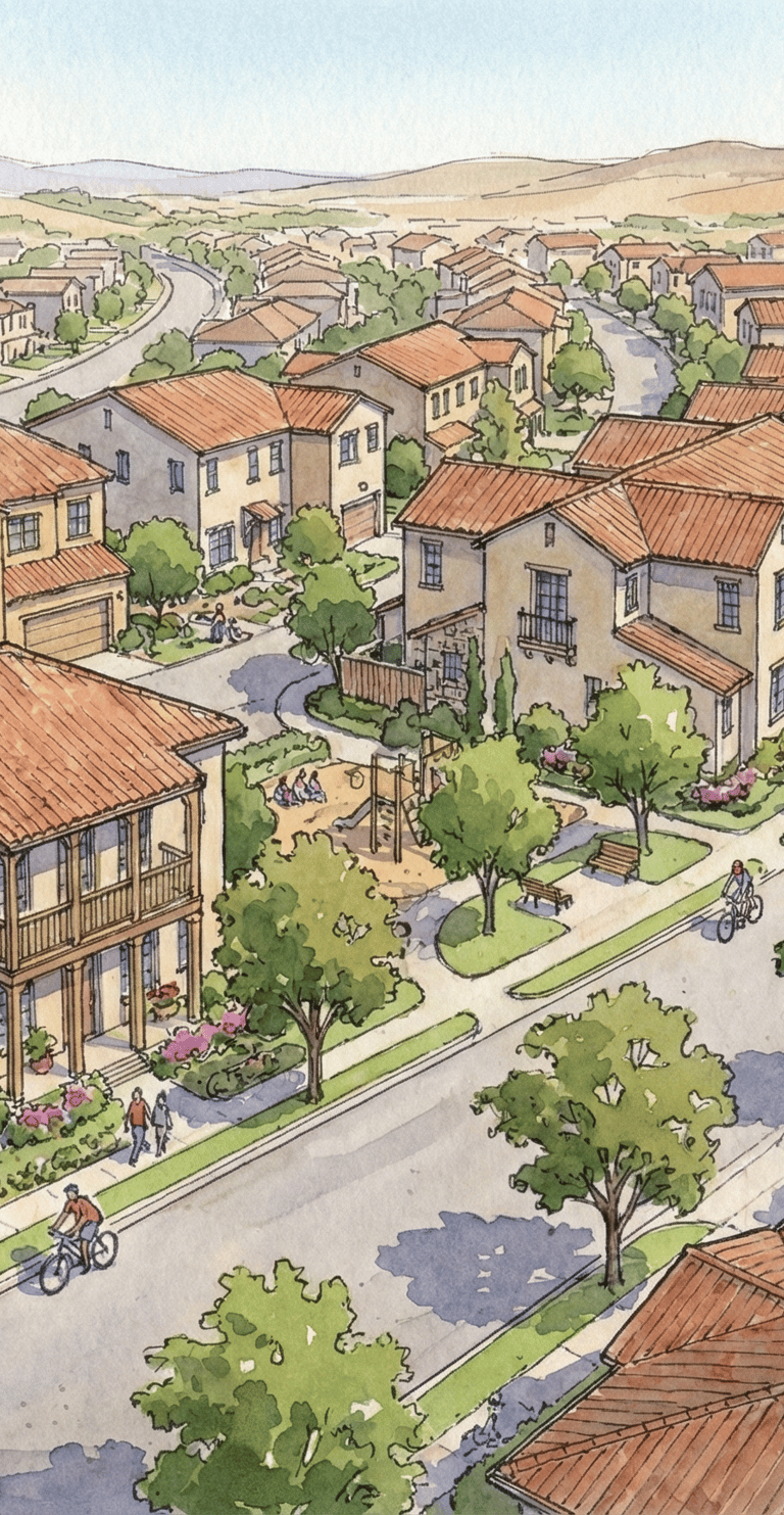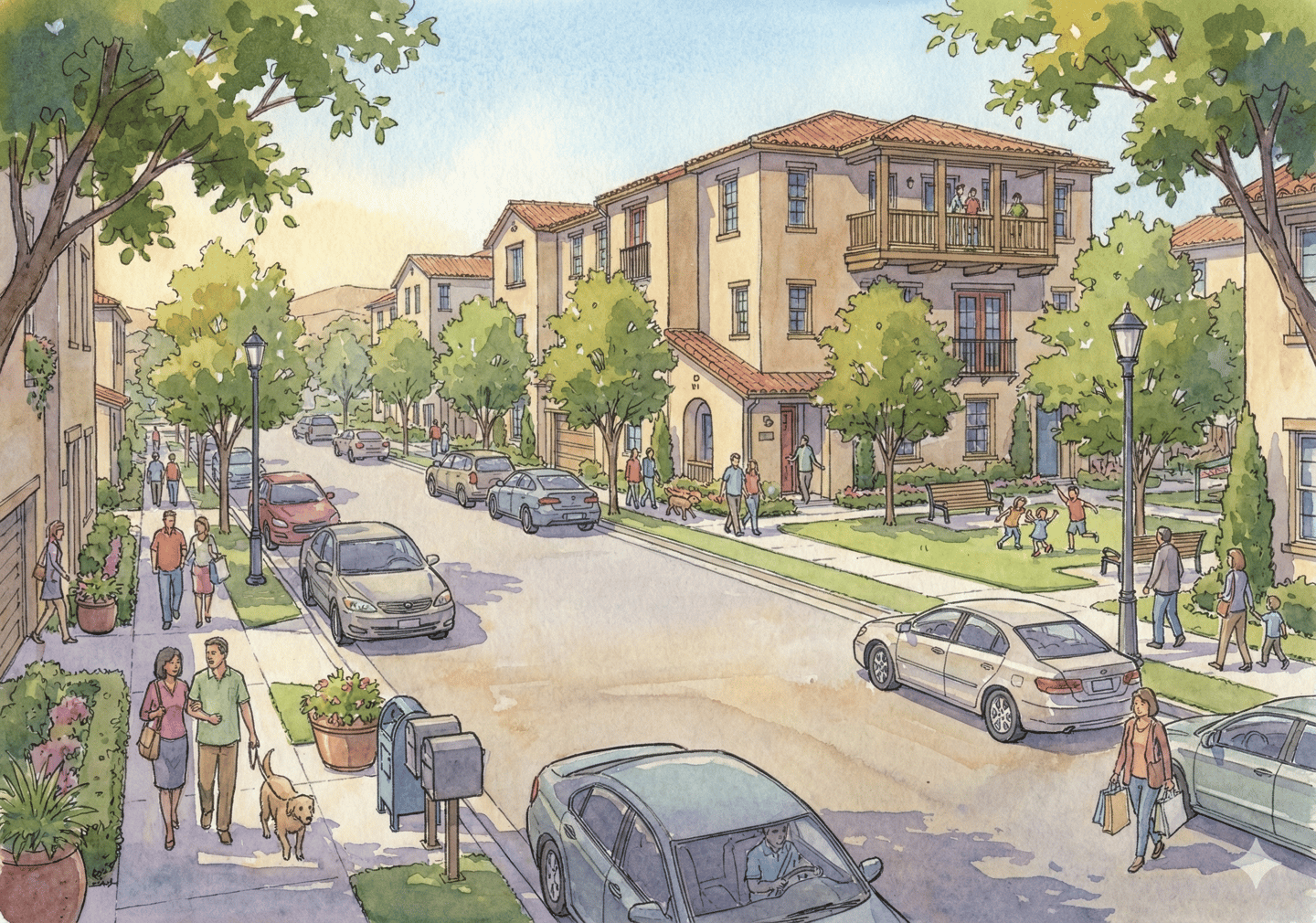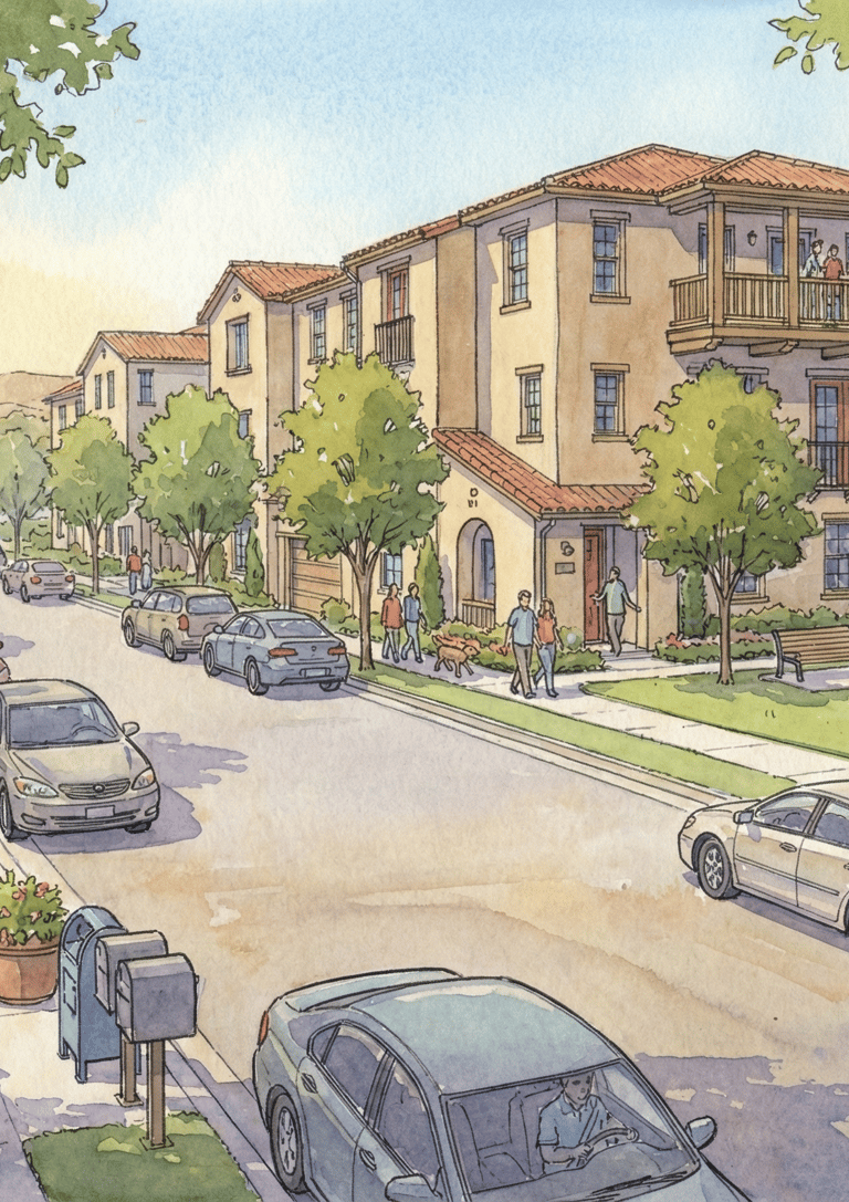 Tree-lined streets and front-facing homes create a comfortable, safe public realm. Slow movement, short blocks, and frequent social edges encourage daily walking and natural neighborhood interaction.