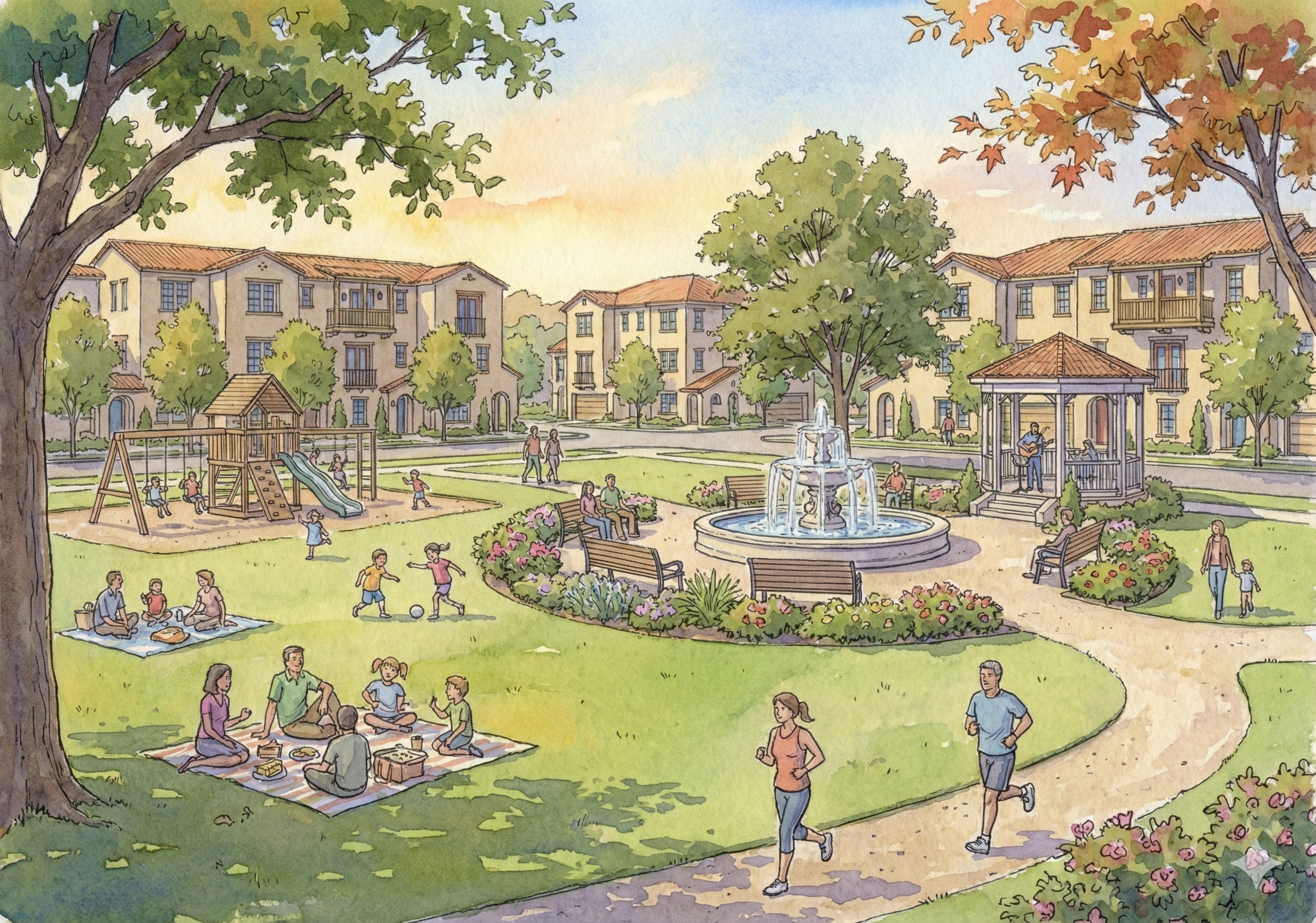 A shared green heart designed for all ages play, picnics, and informal events anchored by a fountain landmark and framed by civic edges that keep the space active throughout the day.