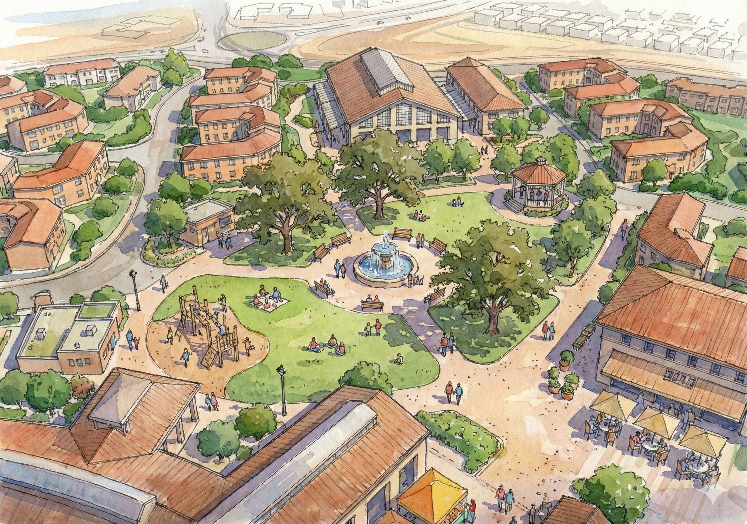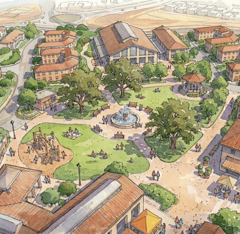 The district’s public living room where learning, local commerce, and everyday meetings overlap. Shaded seating and a compact plaza layout support weekly markets, small events, and daily community life.