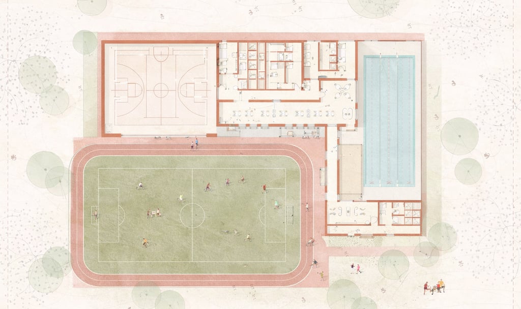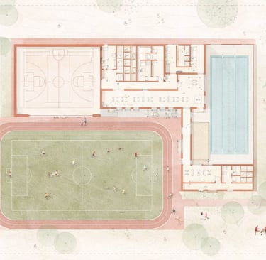 The plan organizes THE ACTIVE as a clear, walkable sports campus where outdoor activity anchors the site and indoor facilities align around it for direct access and efficient operation. At the center, the football field and running track form the primary public ground visible, legible, and easy to navigate. Along the perimeter, the building is structured as two main program bars: a multi-purpose sports hall and an indoor swimming pool hall, positioned to work independently while remaining connected through shared support spaces.