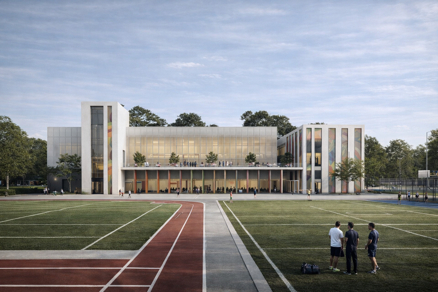 At night the complex becomes a visible, safe landmark. Transparency turns activity into identity and extends community use beyond daytime hours.