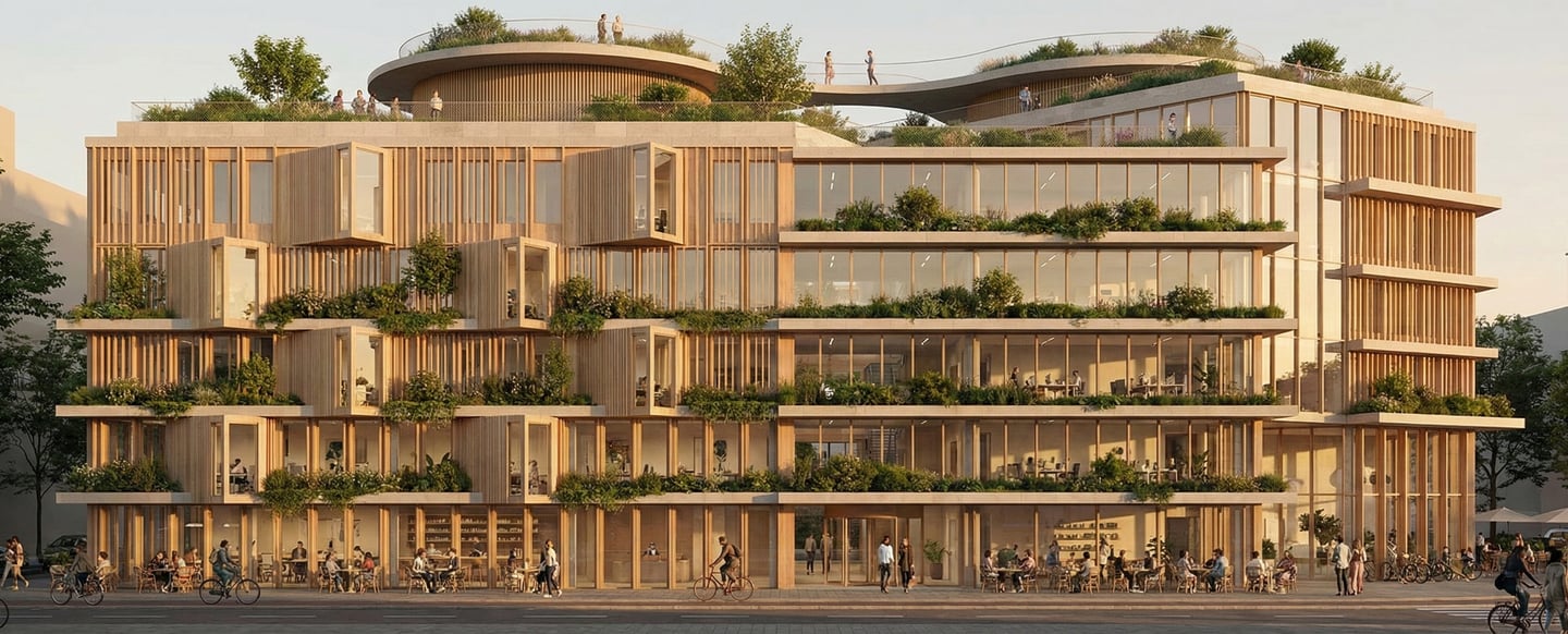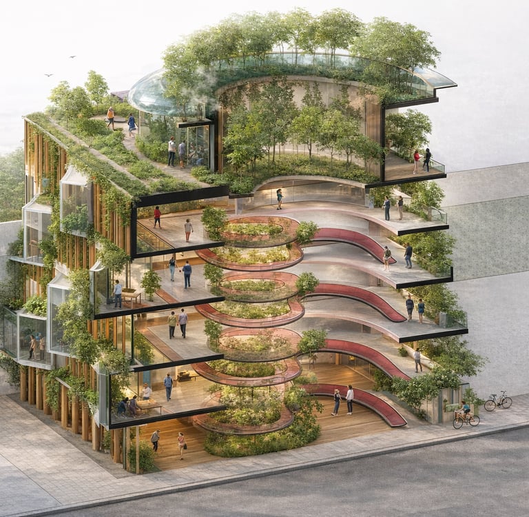 THE COMMONS is a contemporary office building designed as a vertical neighborhood for work. Instead of stacking isolated floors, the project is organized around a continuous network of shared commons, green terraces, collaborative lounges, and connected circulation so interaction happens naturally as part of the daily routine.