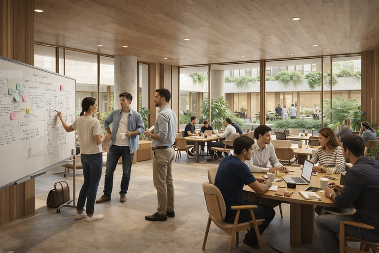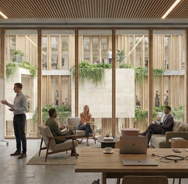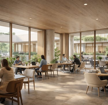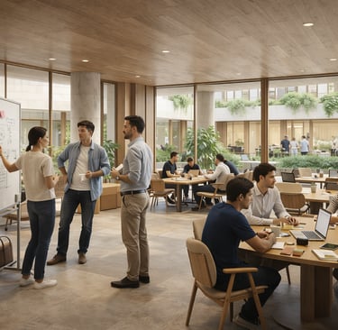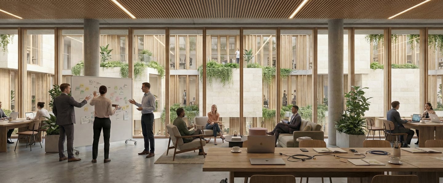 The interior is designed as a landscape of work modes focus, teamwork, quick meetings, and informal exchange within a single connected commons. Daylight, greenery, and flexible furniture allow the space to shift throughout the day, supporting both productivity and culture.