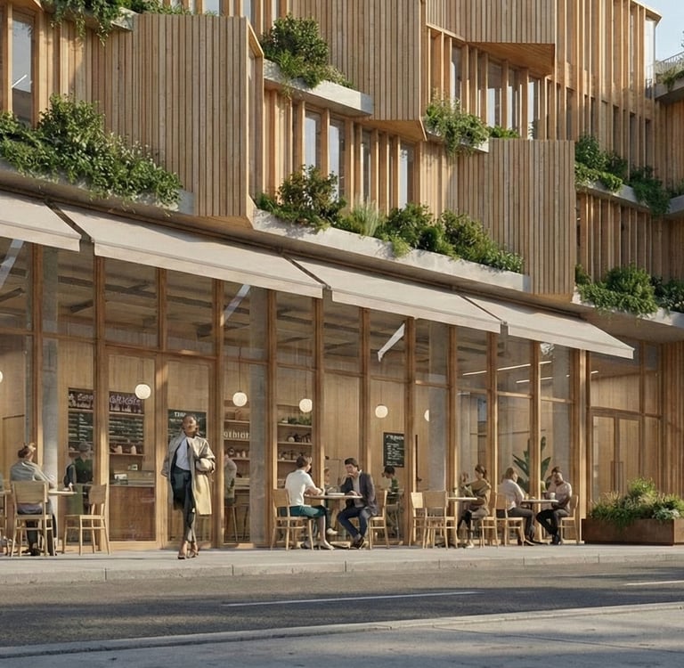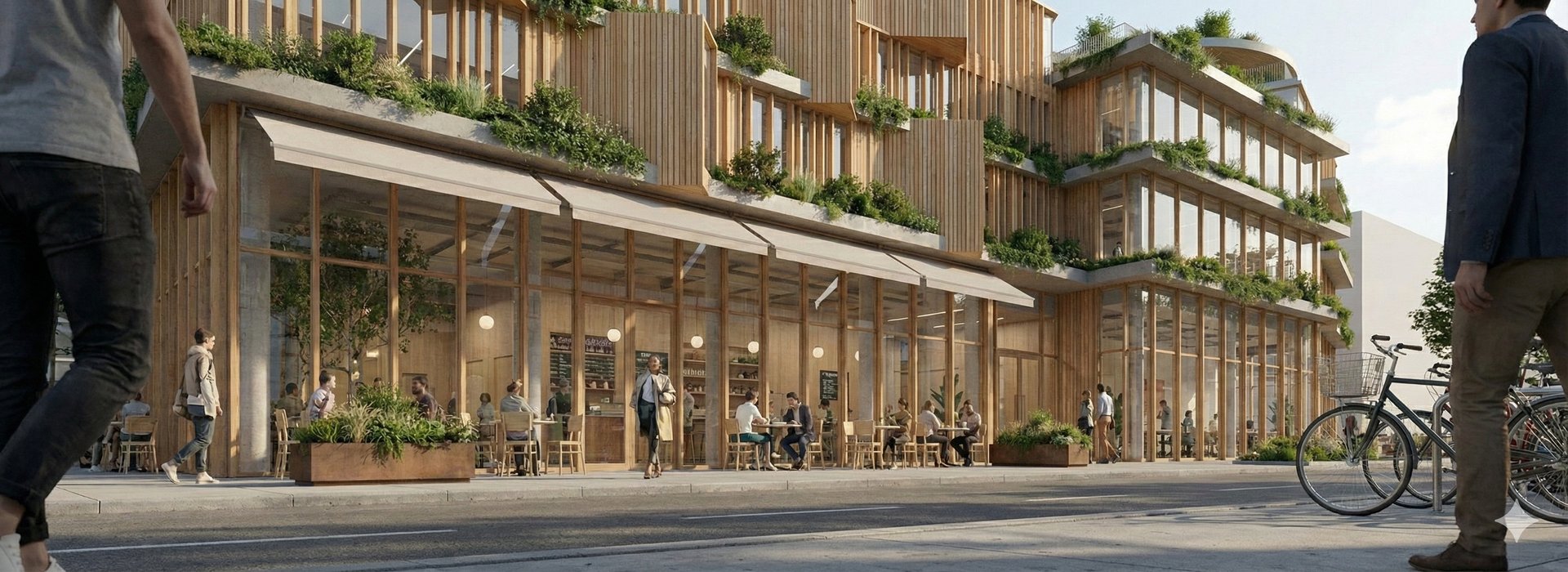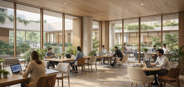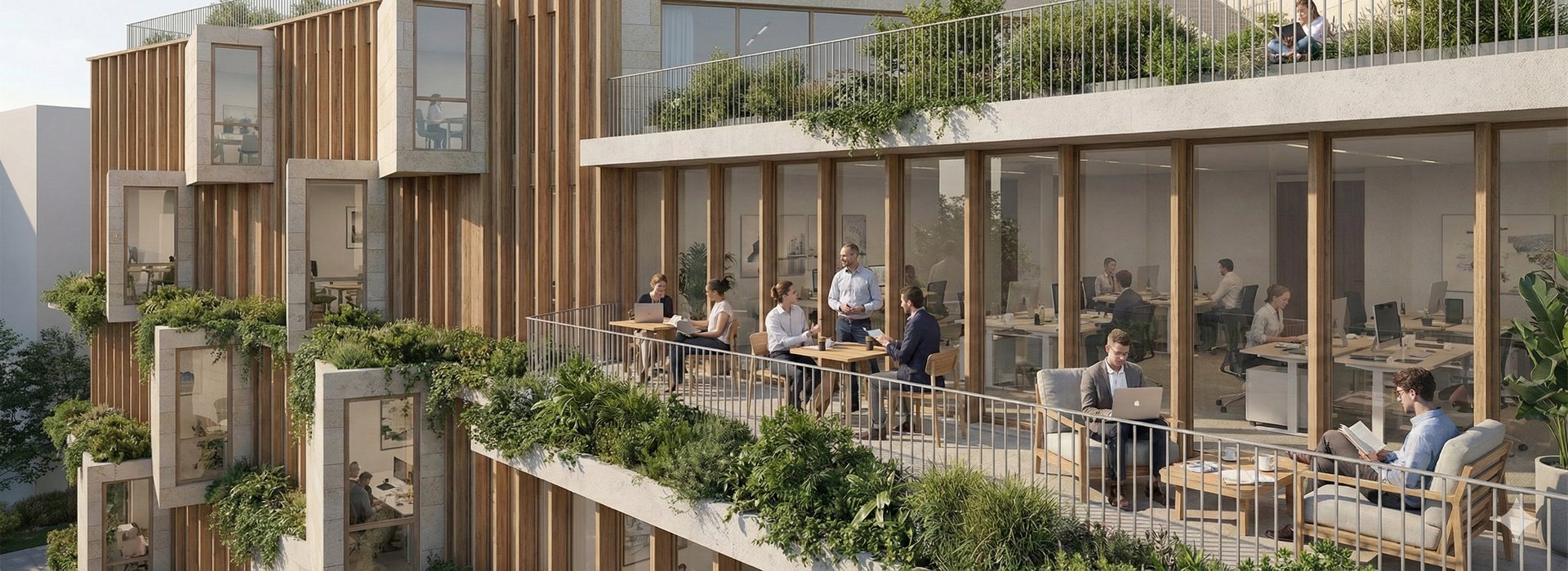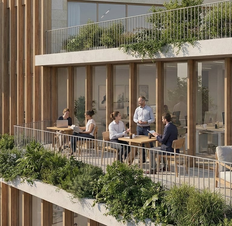 Terraces act as breakout rooms in the open air. The façade depth provides shade and comfort, while the planted edges soften the workplace and create micro-environments for small meetings, calls, and focused solo work.
