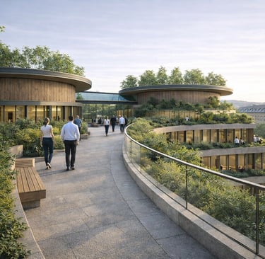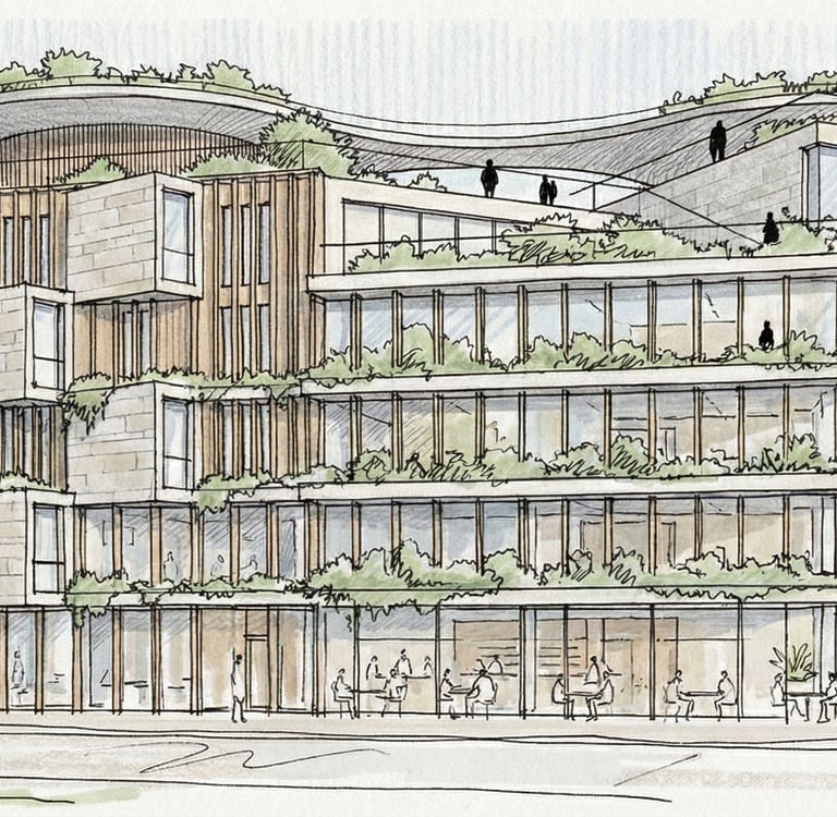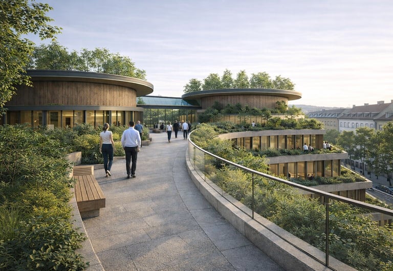 The roof is conceived as an extension of the workplace, not an amenity add-on. A planted promenade offers movement, fresh air, and pause, supporting mental reset and social encounters as part of the workday.